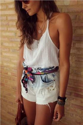 同樣的方式系在腳腕上也很有特點呢~不規則褲腳+同色系絲巾美呆啦~