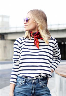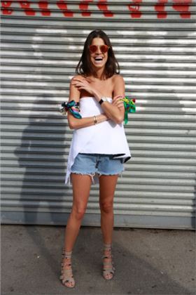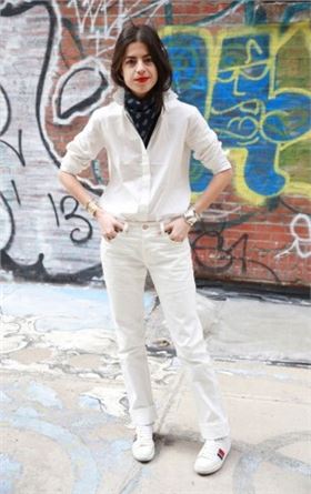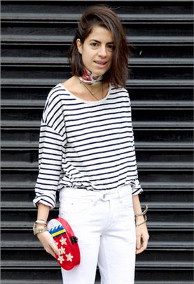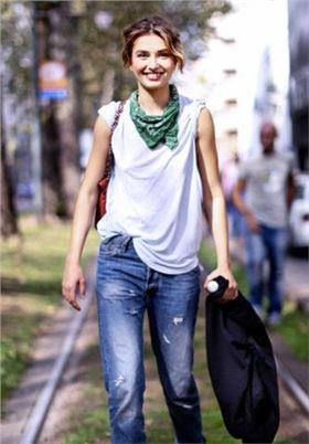 那么學完教程再來看看“手絹狂人”莉安德拉·梅丁(Leandra Medine)的搭配,(至于我為什叫她手絹狂人,下文分階段慢慢揭曉)夏天白T恤和牛仔褲大家總不會少,但這樣一點都不打眼,而一塊花手絹就能穿戴出博主氣息,為了不讓人誤以為你戴著毛巾,一定要把絲巾的飄逸感戴出來。