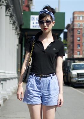 夏天有一個清爽的發型會加分不少,如果你懶得每天扎頭發,那就用絲巾來幫你一把。要是你想來個加分選項,那么綁個丸子頭;頭巾和服飾上有個顏色對應,在這方面也可以注意一下,比如這位是頭巾和褲子顏色。