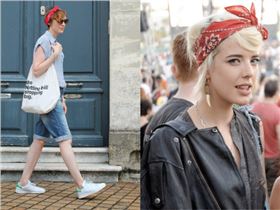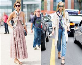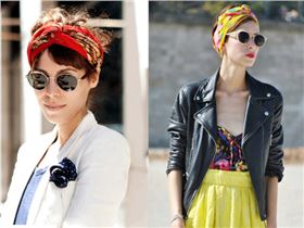 由于這種系法比較復古,搭配墨鏡一起來更有范,頭發長了可以盤成短發,讓頭巾更突出,右邊這位讓絲巾的顏色和裙子來個呼應也是相當可取的。