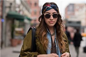 繞頭結就有些異域風情了,在時尚界也是超流行的一款系絲巾的方式。在系這個結時,保持頭部絲巾兩端的一致,在額頭前方扭轉在一起后,繞到脖子后系上一個結。