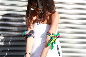 實用的絲巾用來繞手腕的搭配方案不但簡單,并且還能減去不少手鐲的開支。首先折疊你的絲巾,折疊到合適的寬度,在手腕上繞兩次,系一個簡單的結就可以了。